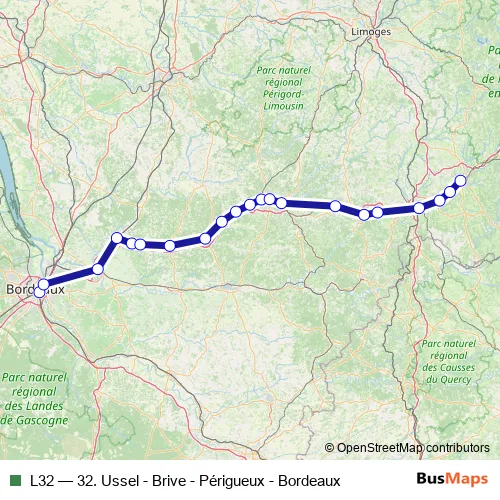 The first stop of the L32 rail route is Bordeaux Saint-Jean and the last stop is Tulle. L32 (32. Ussel - Brive - Périgueux - Bordeaux) is operational during tous les jours.