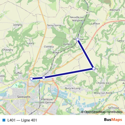 The first stop of the L401 bus route is Margival-Place DE LA Mairie Abri and the last stop is Crouy - Clemencin TUS R. L401 (Ligne 401) is operational during tous les jours.