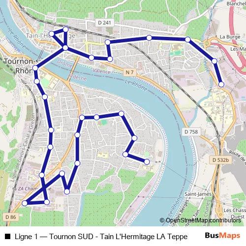 Click here to view the nearest Ligne 1 - Tournon SUD - Tain L'Hermitage LA Teppe bus stop.