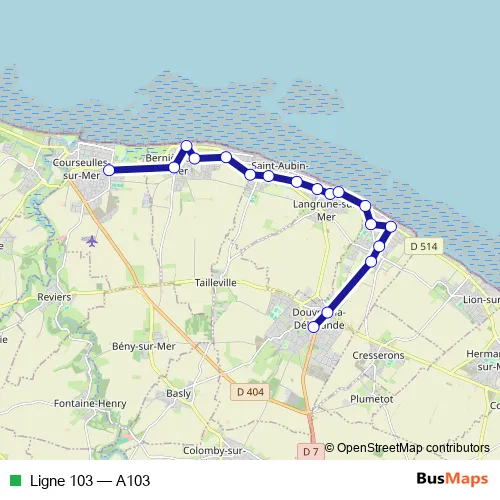 The first stop of the Ligne 103 bus route is Courseulles SUR Mer: collège and the last stop is Douvres LA Delivrande: europe. Ligne 103 (A103) is operational during en semaine.