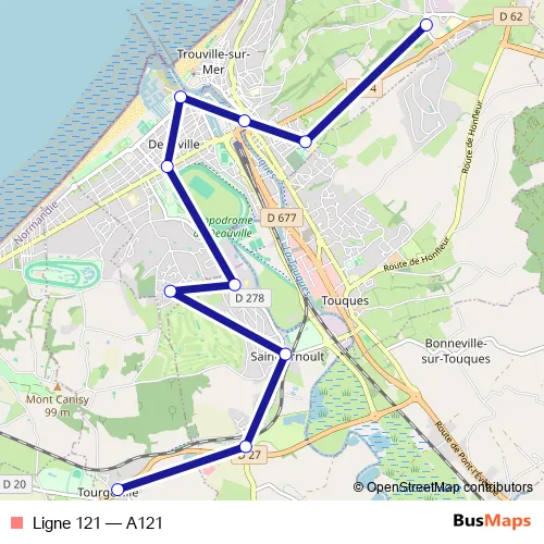 The first stop of the Ligne 121 bus route is Trouville SUR Mer: marie joseph and the last stop is Tourgeville: ecole. Ligne 121 (A121) is operational during en semaine.