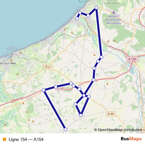 The first stop of the Ligne 154 bus route is Deauville: église and the last stop is Leaupartie: église. Ligne 154 (A154) is operational during en semaine.