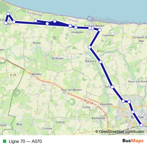 The first stop of the Ligne 70 bus route is Grandcamp Maisy: maisy église and the last stop is Bayeux: gare. Ligne 70 (A070) is operational during tous les jours.