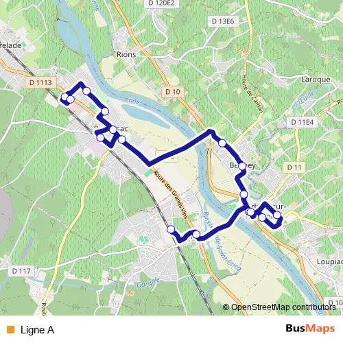 The first stop of the Ligne A bus route is Cérons - Gare and the last stop is Centre Commercial. Ligne A is operational during tous les jours.