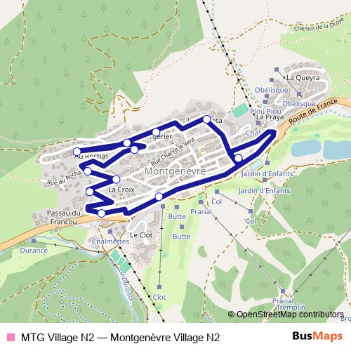 The first stop of the MTG Village N2 bus route is Montgenevre- Gare Routiere and the last stop is Montgenevre- Gare Routiere. MTG Village N2 (Montgenèvre Village N2) is operational during tous les jours.