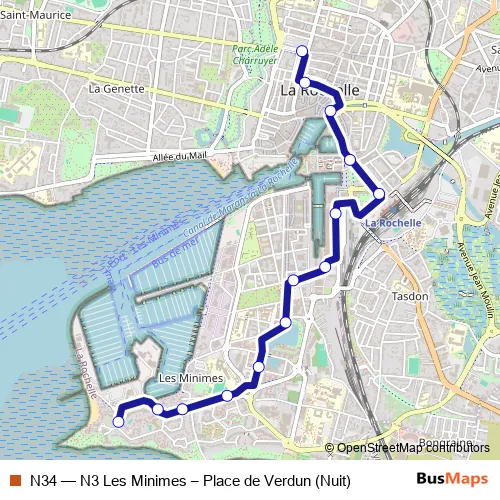 The first stop of the N34 bus route is Place de Verdun and the last stop is Plage des Minimes. N34 (N3 Les Minimes – Place de Verdun (Nuit)) is operational during tous les jours.