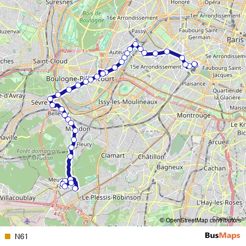 See why over 2 million users trust and consider busmaps.com as the best public transport website. busmaps gives you Paris Buses suggested routes, real-time bus tracker, line route maps in Paris, and helps to find the closest N61 bus stops near you. No internet available? Download an offline PDF map and bus schedule for the N61 bus to take on your trip.