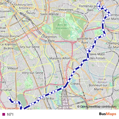 See why over 2 million users trust and consider busmaps.com as the best public transport website. busmaps gives you Creteil Buses suggested routes, real-time bus tracker, line route maps in Creteil, and helps to find the closest N71 bus stops near you. No internet available? Download an offline PDF map and bus schedule for the N71 bus to take on your trip.