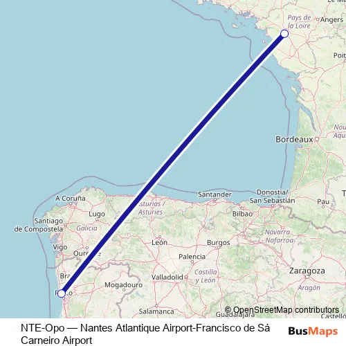 The first stop of the NTE-Opo bus route is Aéroport de Porto and the last stop is Aéroport Nantes Atlantique. NTE-Opo (Nantes Atlantique Airport-Francisco de Sá Carneiro Airport) is operational during tous les jours.