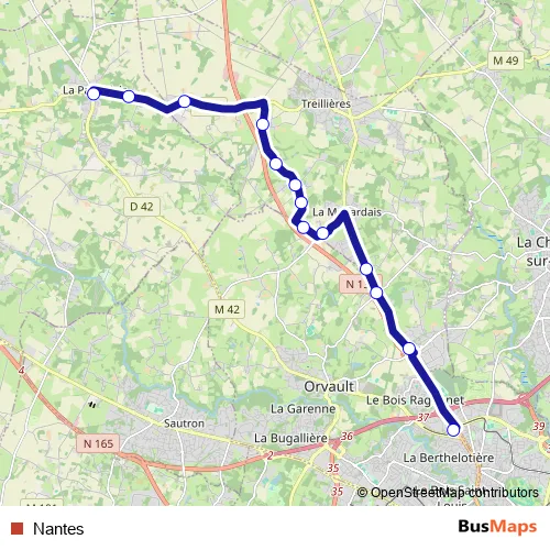 The first stop of the Nantes bus route is Le Cardo and the last stop is La Paquelais. Nantes is operational during en semaine.
