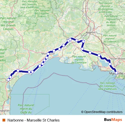 Narbonne - Marseille St Charles rail Route Map