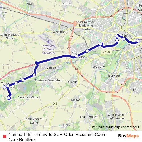 The first stop of the Nomad 115 bus route is Gare routière and the last stop is Pressoir. Nomad 115 (Tourville-SUR-Odon Pressoir - Caen Gare Routière) is operational during en semaine.