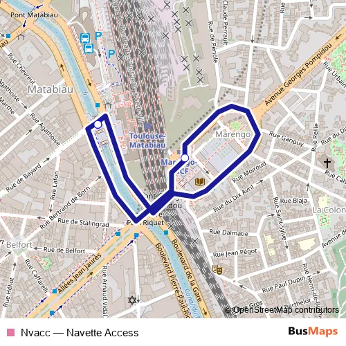 The first stop of the Nvacc bus route is Matabiau Gare Sncf and the last stop is Matabiau Gare Sncf. Nvacc (Navette Access) is operational during tous les jours.