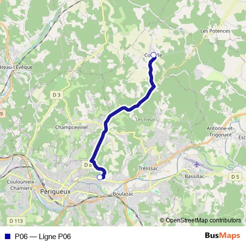 The first stop of the P06 bus route is Trelissac Ecole Maurilloux and the last stop is Cornille Bourg. P06 (Ligne P06) is operational during en semaine.