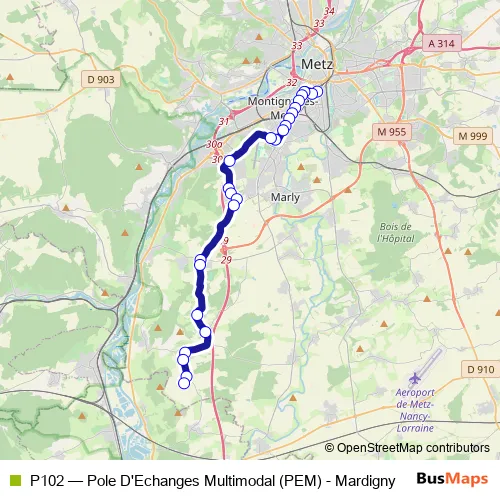 The first stop of the P102 bus route is Pole Multimodal and the last stop is Mardigny. P102 (Pole D'Echanges Multimodal (PEM) - Mardigny) is operational during tous les jours.