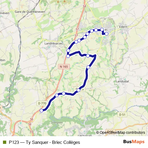 The first stop of the P123 bus route is Collège Pierre Stéphan and the last stop is Ty Sanquer. P123 (Ty Sanquer - Briec Collèges) is operational during en semaine.
