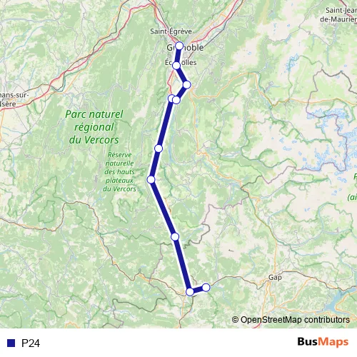 The first stop of the P24 bus route is Veynes-Devoluy and the last stop is