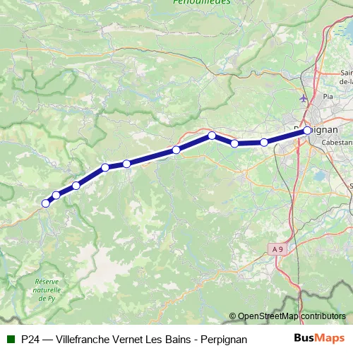 The first stop of the P24 rail route is Perpignan and the last stop is Villefranche - Vernet-les-Bains. P24 (Villefranche Vernet Les Bains - Perpignan) is operational during tous les jours.