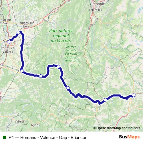 The first stop of the P4 bus route is Valence Ville and the last stop is Gap. P4 (Romans - Valence - Gap - Briancon) is operational during en semaine.