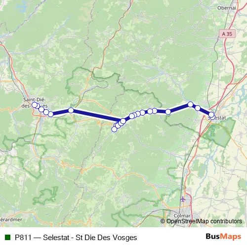 The first stop of the P811 bus route is Sélestat and the last stop is Saint-Dié-des-Vosges. P811 (Selestat - St Die Des Vosges) is operational during tous les jours.