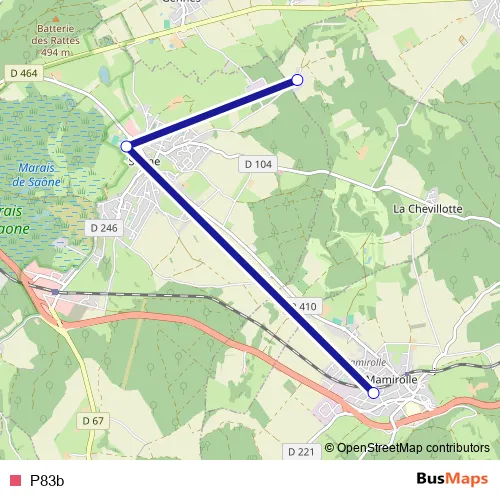 The first stop of the P83b bus route is La Chevillotte - La chevillotte-La grange du bosquet and the last stop is Mamirolle - Halte-Garderie. P83b is operational during tous les jours.
