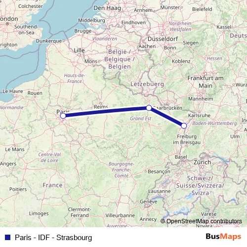 See why over 2 million users trust and consider busmaps.com as the best public transport website. busmaps gives you Strasbourg Rail Services suggested routes, real-time bus tracker, line route maps in Strasbourg, and helps to find the closest Paris - IDF - Strasbourg rail stops near you. No internet available? Download an offline PDF map and bus schedule for the Paris - IDF - Strasbourg rail to take on your trip.