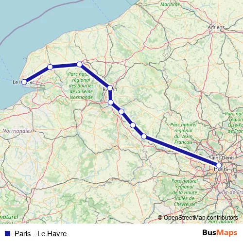 The first stop of the Paris - Le Havre rail route is Gare de Le Havre and the last stop is Gare de Paris Saint-Lazare. Paris - Le Havre (Paris - Le Havre) is operational during tous les jours.