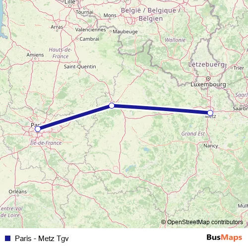 The first stop of the Paris - Metz Tgv rail route is Paris Est and the last stop is Metz. Paris - Metz Tgv (Paris - Metz Tgv) is operational during tous les jours.