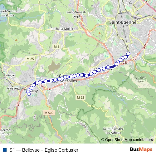 See why over 2 million users trust and consider busmaps.com as the best public transport website. busmaps gives you Saint-Etienne Buses suggested routes, real-time bus tracker, line route maps in Saint-Etienne, and helps to find the closest S1 bus stops near you. No internet available? Download an offline PDF map and bus schedule for the S1 bus to take on your trip.