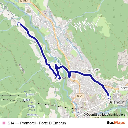 The first stop of the S14 bus route is Briancon- Porte D'Embrun and the last stop is Briancon- Pramorel. S14 (Pramorel - Porte D'Embrun) is operational during en semaine.