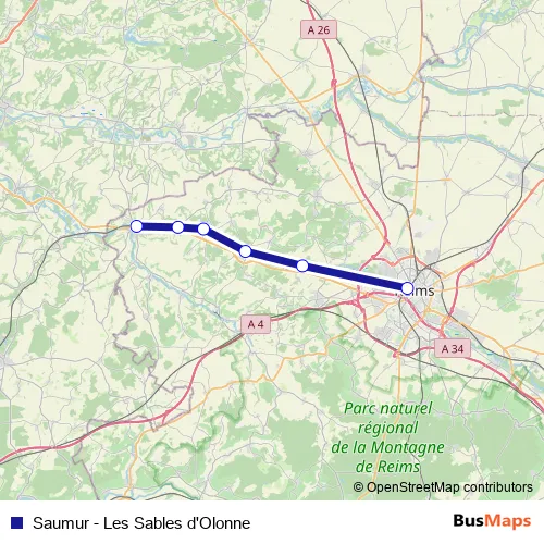 The first stop of the Saumur - Les Sables d'Olonne bus route is Reims and the last stop is Fismes. Saumur - Les Sables d'Olonne (Saumur - Les Sables d'Olonne) is operational during en semaine.