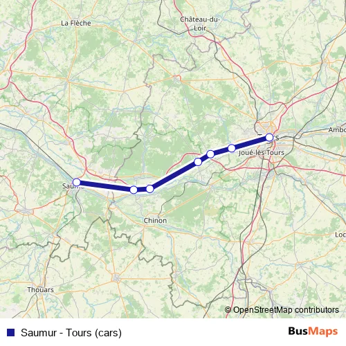 The first stop of the Saumur - Tours (cars) bus route is Tours and the last stop is
