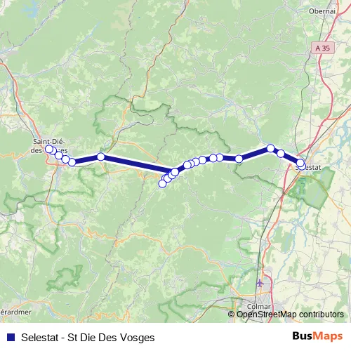 The first stop of the Selestat - St Die Des Vosges bus route is Sélestat and the last stop is Saint-Dié-des-Vosges. Selestat - St Die Des Vosges (Selestat - St Die Des Vosges) is operational during tous les jours.