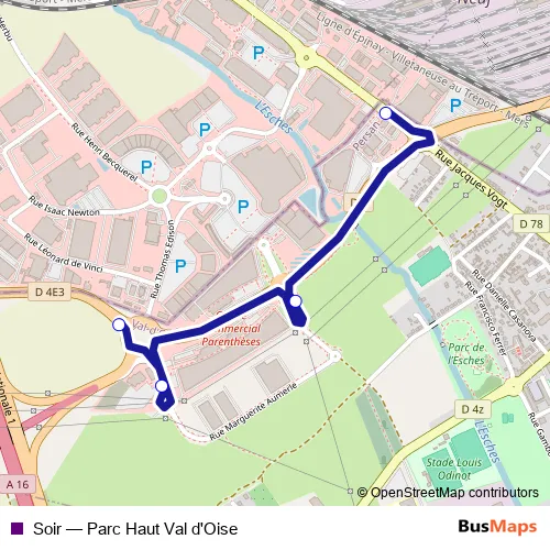 The first stop of the Soir bus route is Parc Haut Val-d'Oise 4 and the last stop is Felix Millet. Soir (Parc Haut Val d'Oise) is operational during tous les jours.