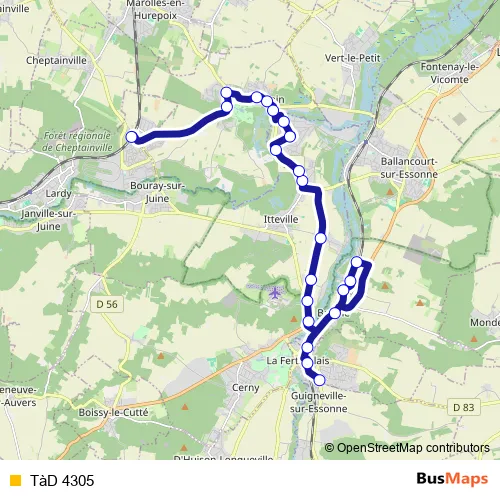 The first stop of the TàD 4305 bus route is Gendarmerie and the last stop is Gare de Bouray. TàD 4305 is operational during tous les jours.