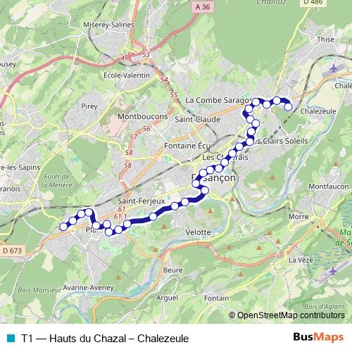 The first stop of the T1 tram route is Chalezeule - Chalezeule and the last stop is Hauts du Chazal. T1 (Hauts du Chazal – Chalezeule) is operational during tous les jours.