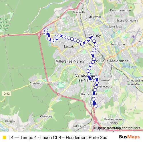 The first stop of the T4 bus route is Laxou Champ-le-Boeuf and the last stop is Houdemont Porte Sud. T4 (Tempo 4 - Laxou CLB – Houdemont Porte Sud) is operational during tous les jours.