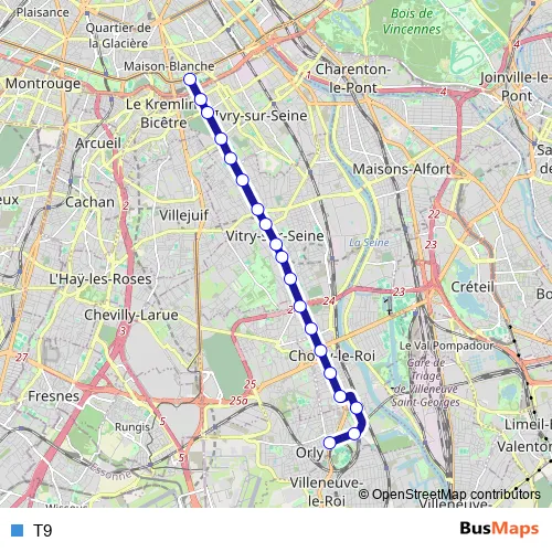 See why over 2 million users trust and consider busmaps.com as the best public transport website. busmaps gives you Paris Trams suggested routes, real-time bus tracker, line route maps in Paris, and helps to find the closest T9 tram stops near you. No internet available? Download an offline PDF map and bus schedule for the T9 tram to take on your trip.