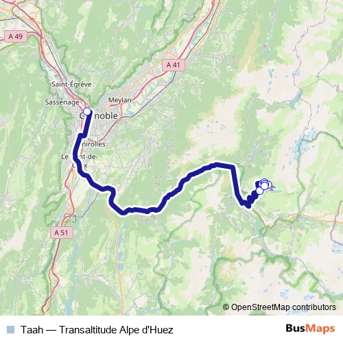 The first stop of the Taah bus route is Gare Routière and the last stop is L'Eclose. Taah (Transaltitude Alpe d'Huez) is operational during tous les jours.