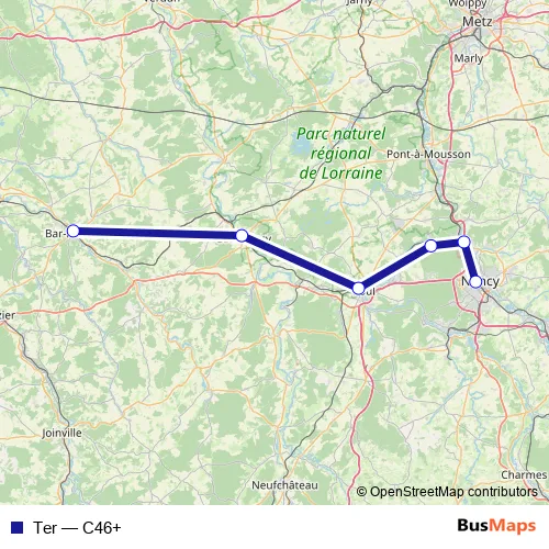 The first stop of the Ter rail route is Nancy and the last stop is Bar-le-Duc. Ter (C46+) is operational during tous les jours.
