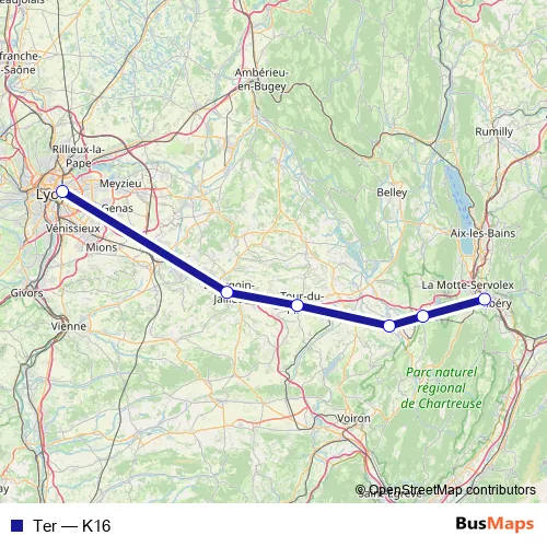 The first stop of the Ter rail route is Chambéry-Challes-les-Eaux and the last stop is Lyon Part Dieu. Ter (K16) is operational during tous les jours.