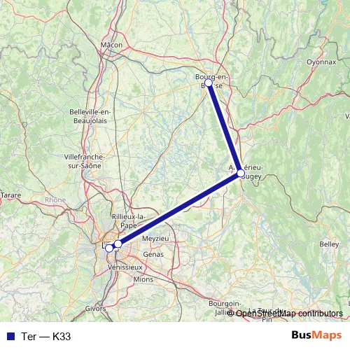 The first stop of the Ter rail route is Lyon Perrache and the last stop is Bourg-en-Bresse. Ter (K33) is operational during tous les jours.