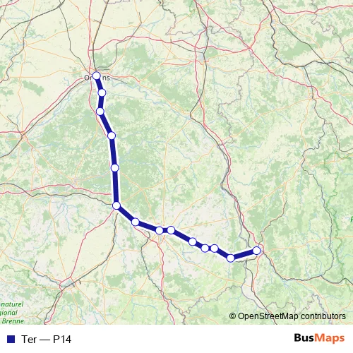 The first stop of the Ter rail route is Orléans and the last stop is Nevers. Ter (P14) is operational during tous les jours.
