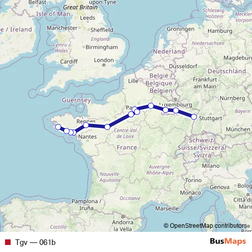 The first stop of the Tgv rail route is Strasbourg and the last stop is Rennes. Tgv (061b) is operational during tous les jours.