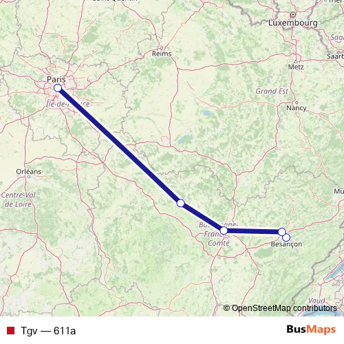 The first stop of the Tgv rail route is Besançon Viotte and the last stop is Paris Gare de Lyon. Tgv (611a) is operational during tous les jours.