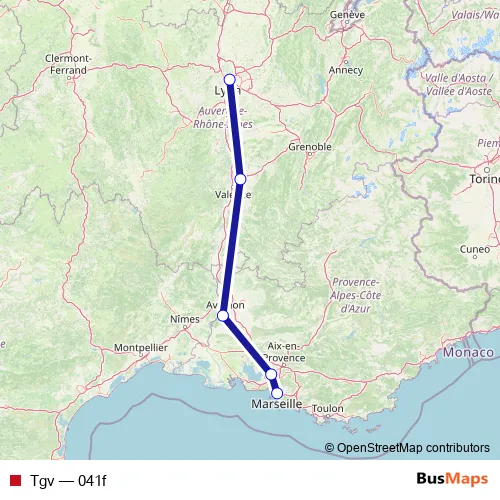 The first stop of the Tgv rail route is Marseille-Saint-Charles and the last stop is Lyon Part Dieu. Tgv (041f) is operational during tous les jours.