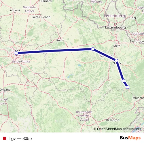 The first stop of the Tgv rail route is Paris-Est and the last stop is Remiremont. Tgv (805b) is operational during tous les jours.
