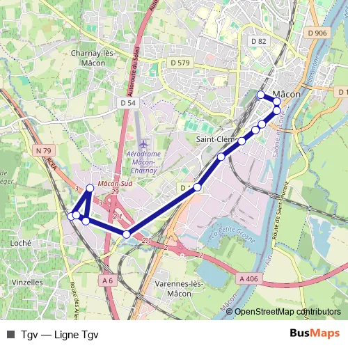 The first stop of the Tgv bus route is Gare Loché Tgv and the last stop is Gare Mâcon Ville. Tgv (Ligne Tgv) is operational during tous les jours.