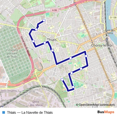 The first stop of the Thiais bus route is Ferme de Grignon and the last stop is Palais Omnisports. Thiais (La Navette de Thiais) is operational during tous les jours.