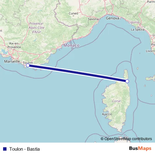 See why over 2 million users trust and consider busmaps.com as the best public transport website. busmaps gives you Bastia Ferries suggested routes, real-time bus tracker, line route maps in Bastia, and helps to find the closest Toulon - Bastia ferry stops near you. No internet available? Download an offline PDF map and bus schedule for the Toulon - Bastia ferry to take on your trip.